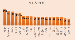 1番多いのはみずタイプで、2番目に多いのはノーマルタイプ、3番目はくさタイプという結果でした。
