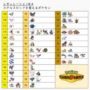 『ポケモンチャンピオンズ』のレギュレーションM-Aで「ステルスロック」を覚えるポケモンを素早さ種族値順に並べると、次のようになります。