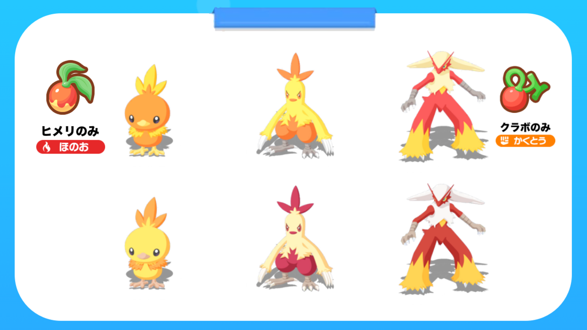 • アチャモ→レベル12+アメ40個でワカシャモに進化→レベル27+アメ80個でバシャーモに進化