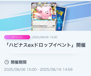 ポケポケの方で、ハピナスexドロップイベント」が開催中です。