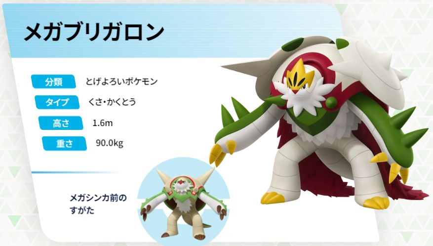 メガシンカのエネルギーが外殻などに流れ込み、全体の防御力が格段に増しています。また、伸びた体毛の一部が衝撃を吸収するマントのような働きをします。どのような攻撃にも耐える自信があり、決して取り乱すことはなく、不動心を持ちます。