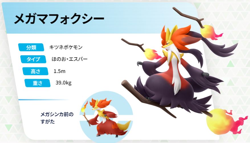 エスパーとしての能力が向上。浮遊させた2本の木の枝を、まるで魔法で意思が与えられたかのように動かし、見ている相手を惑わします。自身も発火させた大きな木の枝に乗って浮遊しており、さらに相手を幻惑。錯乱状態の相手とは対照的に、メガマフォクシーは冷静沈着で、的確な攻撃でダメージを与えます。