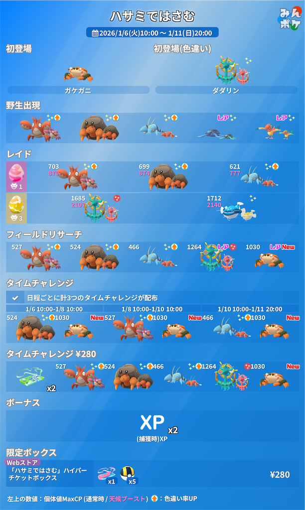 初登場のガケガニは野生無しでフィールドリサーチはレア枠になってますが、タイムチャレンジクリアで3匹手に入るのは良いですね。