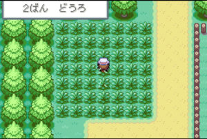 この草むらに出現するポケモンは最大でもレベル5なので、レベル6~50のポケモンを先頭にしてスプレーを使いましょう。